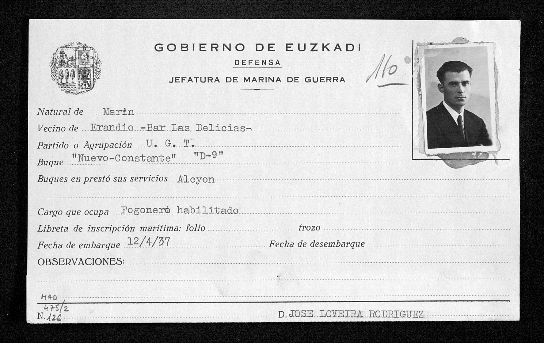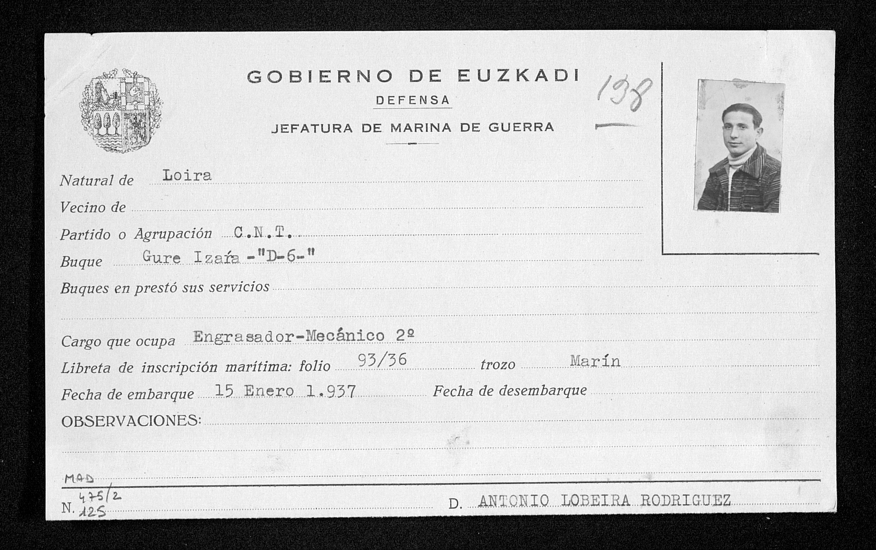 Antonio Lobeira, máis novo, teno todo moi claro desde o inicio. O primeiro que fai ao chegar a Pasaia, o 1 de abril de 1934, con só 18 anos, é afiliarse ao sindicato de orientación anarquista “Avance Marino” de Pasaia, ligado á CNT. É o socio nº 282 desta agrupación sindical, e xa exerce como fogoneiro na frota pesqueira, aínda que en realidade é engraxador-mecánico de 2ª en buques de pesca.