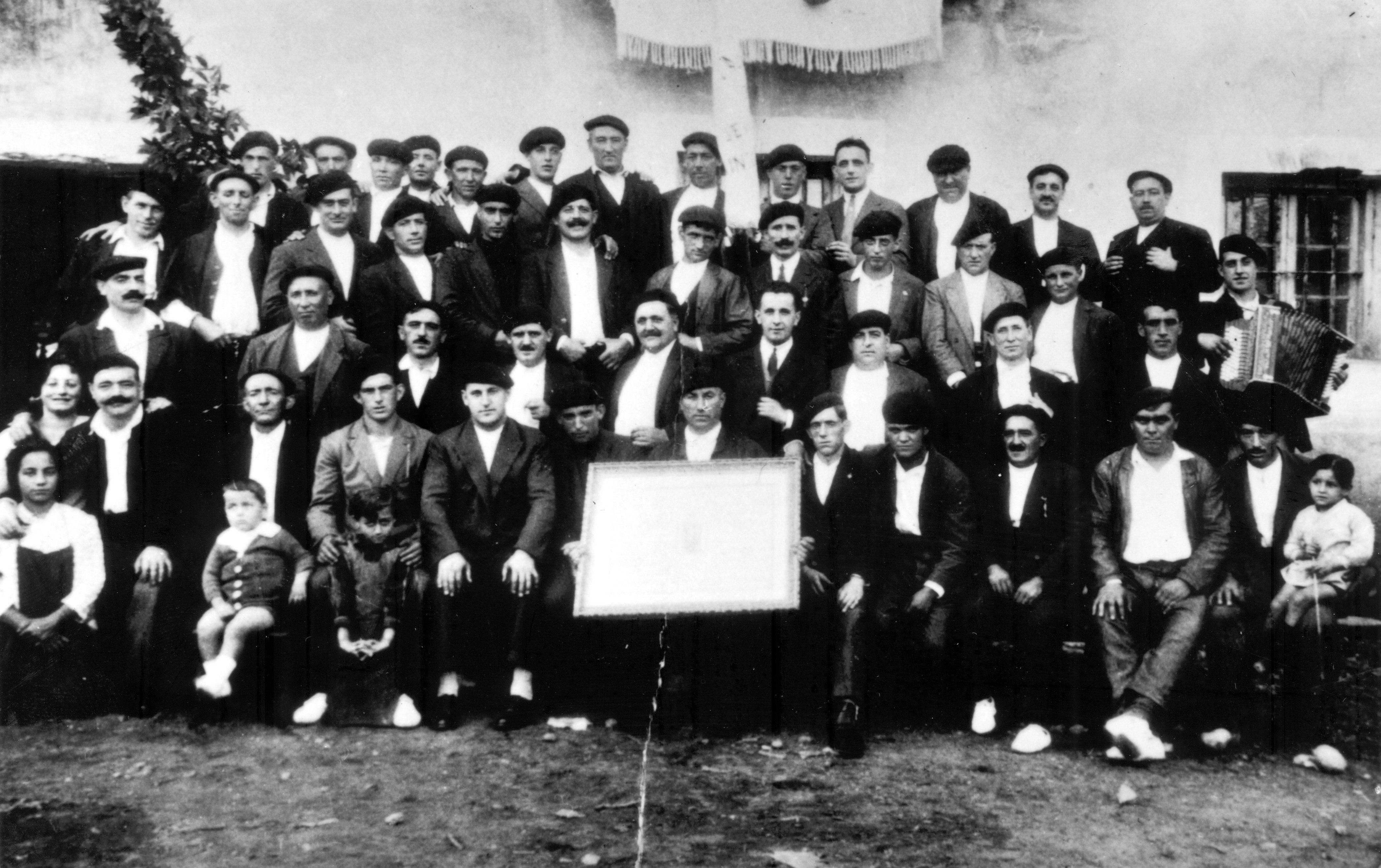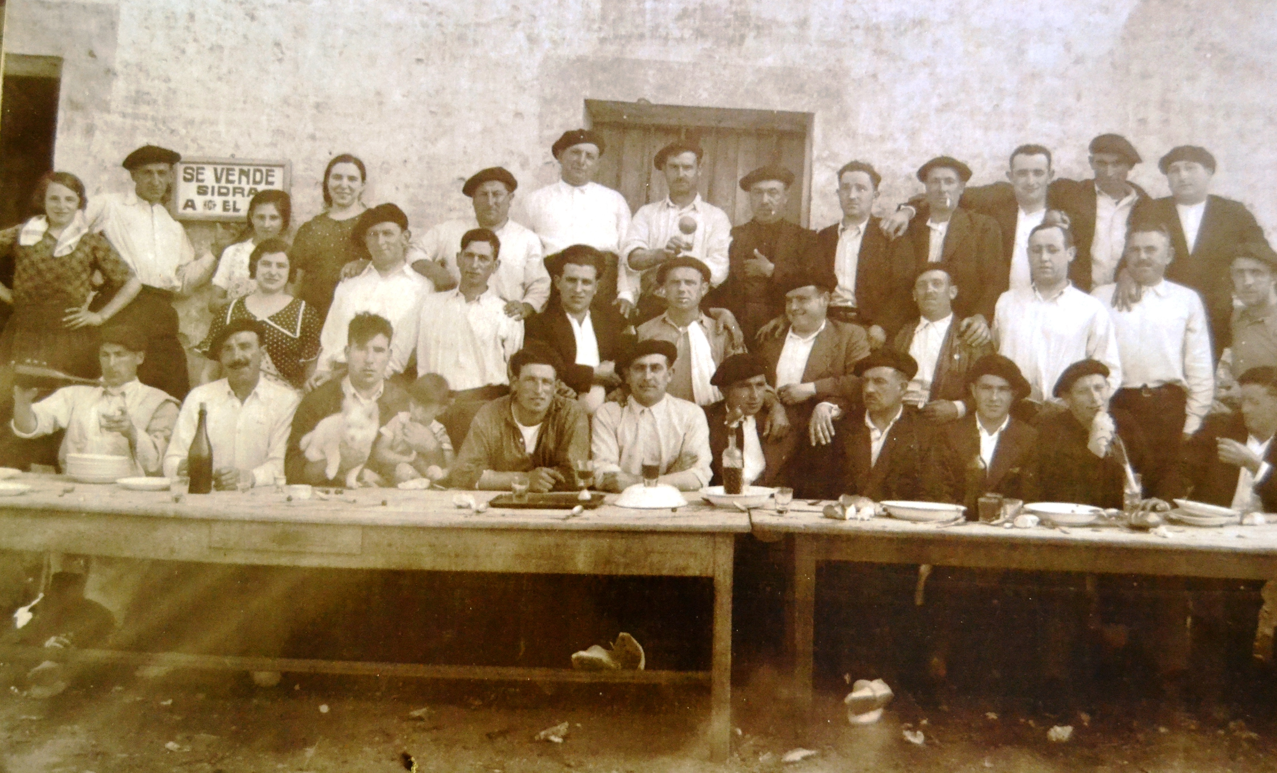 Besteak beste, aurrean, erdian diplomarekin Fidel Tolaretxipi “Txingurri”, sagardotegiko jabea; bigarrena ezkerrera, Juan Ansa; hirugarrena eskuinera, Valentin Extremo; eta laugarrena Juan Aranburu. Bigarren ilaran, lehenengoa ezkerretik Emerita Tolaretxipi; haren atzean, Santiago Ijurko. Goian, lehenengoa eskuinetik Jose Antonio Lasa; hirugarrena eskuinetik Patxi Eguzkiza. Manolo Eguzkiza soinuarekin; ilara berean, hirugarrena, Lete; eta seigarrena, bibotearekin, Ignacio Lasconateguy.